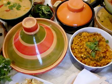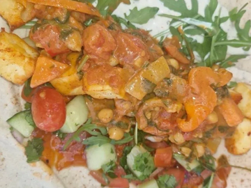 A rich and sweet curry slow cooked with peanuts, kefir lime leaves and coriander, filled with chunky vegetables like sweet potato and mango.